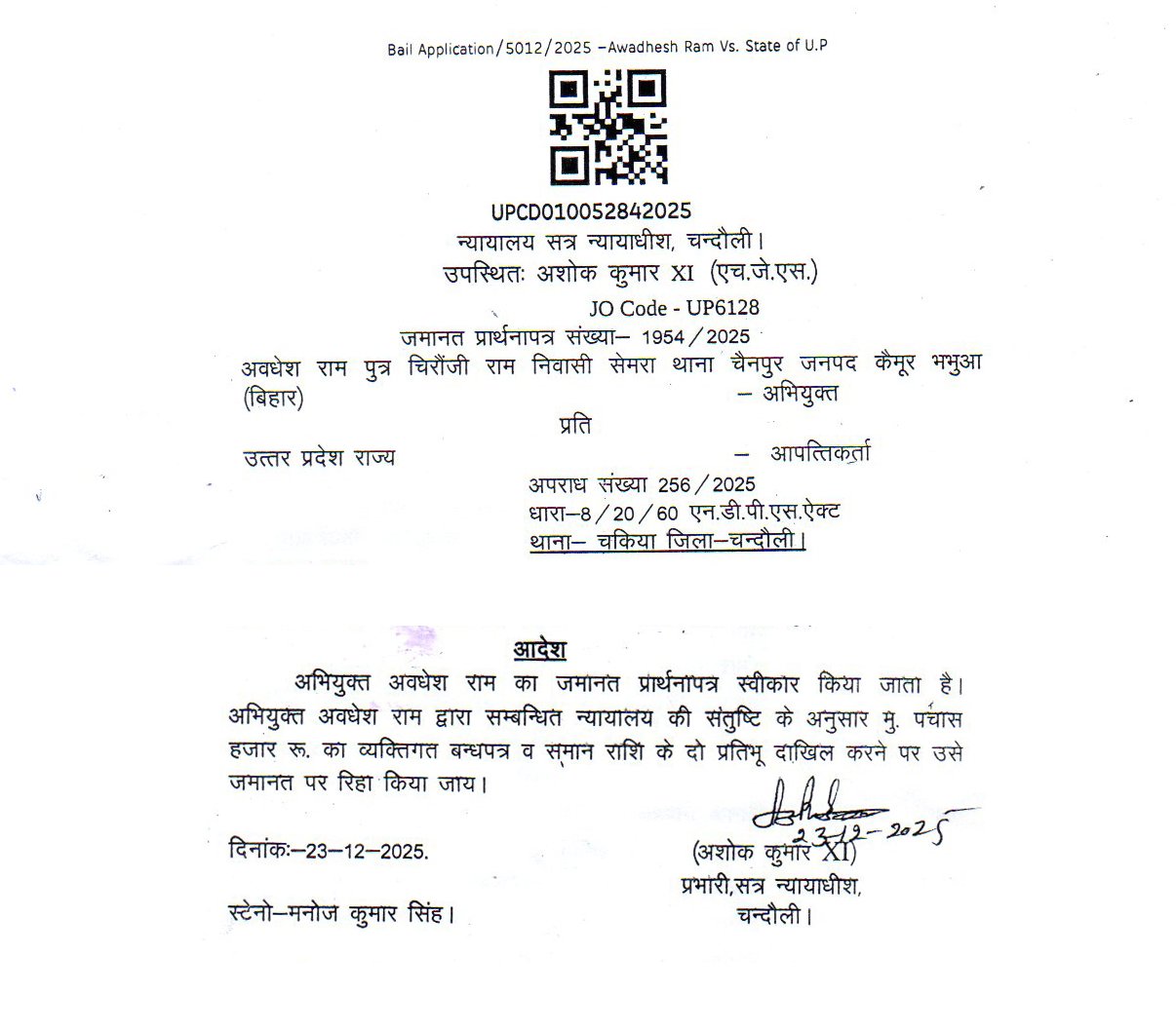 Young Writer, चंदौली। प्रभारी सत्र न्यायाधीश अशोक कुमार-XI की अदालत ने मंगलवार को एनडीपीएस एक्ट से जुड़े मामले की सुनवाई की। इस दौरान उन्होंने बचाव पक्ष के साथ ही अभियोजन पक्ष के अधिवक्ताओं के तर्क को सुना। साक्ष्यों का अवलोकन करने के उपरांत अभियुक्त अवधेश राम की जमानत याचिका को स्वीकार कर लिया। न्यायालय ने अभियुक्त को पचास हजार रुपये के व्यक्तिगत बंधपत्र व समान राशि के दो प्रतिभू दाखिल करने पर जमानत पर रिहा करने का आदेश जारी किया है।