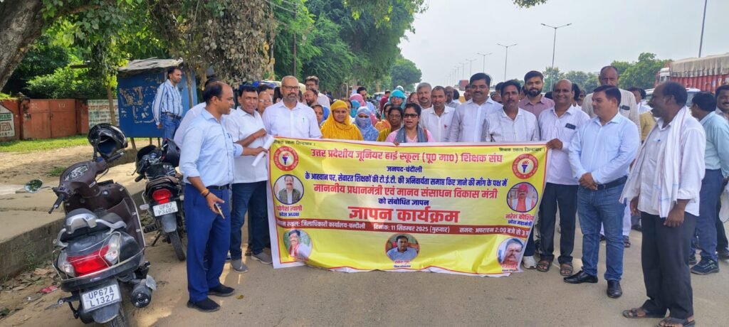 Chandauli:पूर्व माध्यमिक शिक्षक संघ के बैनर तले शिक्षकों ने मुख्यालय पर किया विरोध प्रदशर्न