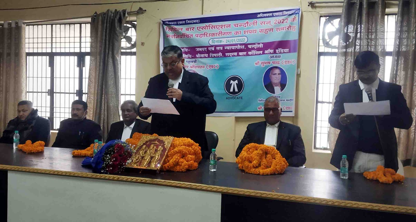 Young Writer, चंदौली। सिविल बार एसोसिएशन के नवनिर्वाचित पदाधिकारियों का शपथ ग्रहण समारोह सोमवार को तहसील सभागार में आयोजित हुआ। इस दौरान विशिष्ट अतिथि यूपी बार कौंसिल के श्रीनाथ त्रिपाठी समारोह में शरीक हुए। सिविल बार एसोसिएशन के अध्यक्ष सुभाष चन्द्र व महामंत्री संजीव कुमार समेत कार्यकारिणी के लोगों ने पद एवं गोपनीयता की शपथ ली। साथ ही अधिवक्ता हित में कार्य करने के संकल्पों को दोहराया। इस अवसर तालियों की गड़गड़ाहट से पूरा तहसील सभागार गूंज उठा।
