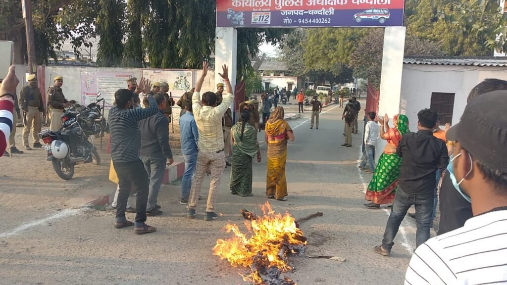 Young Writer, चंदौली। इंडियन बैंक शाखा के बाहर आंदोलित लाकर धारियों की समस्या को सुनने बुधवार को विधायक सुशील सिंह पहुंचे। उन्होंने पुलिस अधीक्षक अंकुर अग्रवाल को लाकरधारियों की समस्या से अवगत कराया। साथ ही पीड़ित लाकरधारियों की तहरीर लेकर तत्काल बैंक कर्मचारियों और प्रबंधक सहित अन्य आला अधिकारियों के खिलाफ लापरवाही का मुकदमा दर्ज किए जाने की बात कही। शाम होते-होते नाराज लाकरधारियों ने पुलिस लाइन गेट पर डीएम व एसपी का पुतला फूंक कर अपना गुस्सा जाहिर किया।