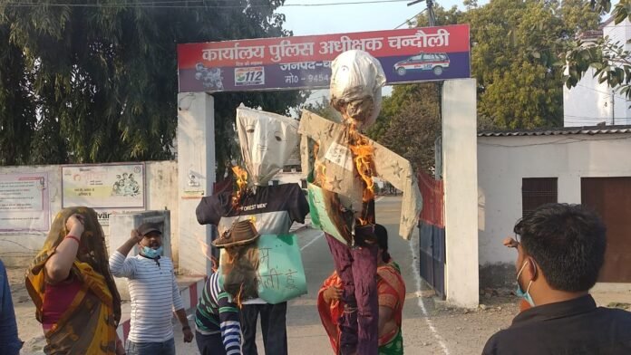 Young Writer, चंदौली। इंडियन बैंक शाखा के बाहर आंदोलित लाकर धारियों की समस्या को सुनने बुधवार को विधायक सुशील सिंह पहुंचे। उन्होंने पुलिस अधीक्षक अंकुर अग्रवाल को लाकरधारियों की समस्या से अवगत कराया। साथ ही पीड़ित लाकरधारियों की तहरीर लेकर तत्काल बैंक कर्मचारियों और प्रबंधक सहित अन्य आला अधिकारियों के खिलाफ लापरवाही का मुकदमा दर्ज किए जाने की बात कही। शाम होते-होते नाराज लाकरधारियों ने पुलिस लाइन गेट पर डीएम व एसपी का पुतला फूंक कर अपना गुस्सा जाहिर किया।