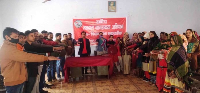 Young Writer, सकलडीहा। क्षेत्र में मतदाता जागरूकता कार्यक्रम जोर शोर से चलाया जा रहा है। इस क्रम में गुरूवार को दूसरे दिन ब्लॉक मुख्यालय पर बीडीओ अरूण पांडेय और एडीओ पंचायत बजरंगी पांडेय के नेतृत्व में शत प्रतिशत मतदान में सहयोग के लिये समूह की महिला और बैंक सखी को संकल्प दिलाया गया। समूह की महिलाओं ने गांव-गांव में पहुंचकर लोगों को शत प्रतिशत मतदान करने का संकल्प को दोहराया।