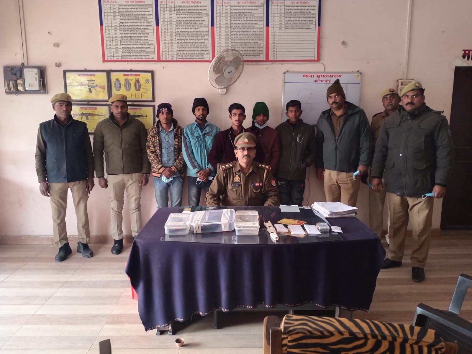 चन्दौली। डीडीयू नगर। प्रभारी निरीक्षक मुगलसराय दीनदयाल पांडेय के नेतृत्व में कोतवाली पुलिस ने मुखबिर की सूचना पर रविवार को मुखबिर की सूचना पर ग्राम छिमिया तिराहे पर छापा मारकर डकैती की योजना बना रहे पांच युवकों को गिरफ्तार कर लिया गया। पुलिस ने उनके पास से तमंचा व कारतूस व चाकू बरामद किया। इस दौरान पुलिस ने गिरफ्तार युवकों से कड़ाई से पूछताछ किया तो उन्होंने बताया कि वे लोग डकैती की योजना बना रहे थे लोग आर्थिक तंगी की वजह से व आर्थिक लाभ के लिए संगठित होकर अपराध करते हैं। युवकों ने बताया कि हम लोगों के पास इस समय पैसे की काफी तंगी पड़ गई थी। इससे हम लोग एक जगहं एकत्रित होकर डकैती डालने की योजना बना रहे थे पुलिस ने बताया कि गिरफ्तार युवकों का एक गैंग है जो संगठित होकर लूट और डकैती का काम करते हैं पकड़े गए डकैतों में मोहम्मद साजिद, फैसल, रवि कुमार चौरसिया, जय गुप्ता, अशरफ शामिल हैं। पकड़े गए डकैतों ने बताया कि हम लोग गैंग बनाकर मोहम्मद साजिद के नेतृत्व में दिशा निर्देश पर लूट व डकैती का कार्य करते हैं। पुलिस ने गिरफ्तार युवकों को विभिन्न धाराओं में जेल भेज दिया।