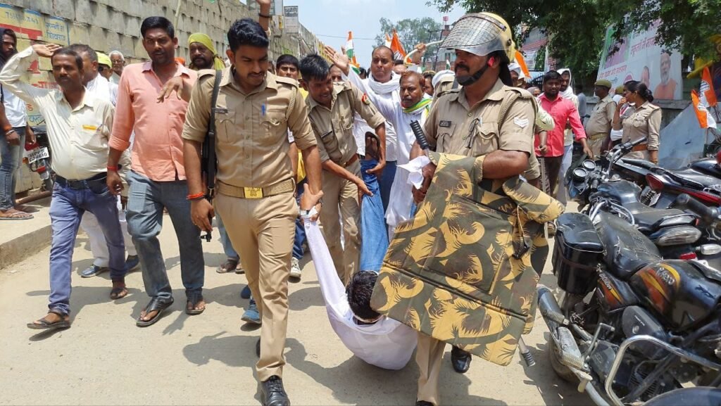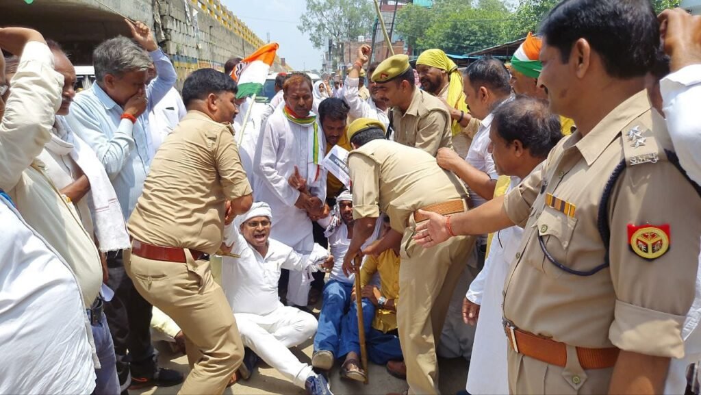 चंदौली। जिला कांग्रेस कमेटी ने शुक्रवार को केंद्र सरकार की गलत नीतियों के कारण बढ़ी बेतहासा महंगाई के विरोध में विरोध प्रदर्शन किया। इस दौरान कांग्रेसियों ने जिलाध्यक्ष धर्मेन्द्र तिवारी की अगुवाई में आसमान छूती महंगाई, बेरोजगारी, देश की आर्थिक बदहाली, जीएसटी की गलत नीतियों के खिलाफ मुख्यालय पर लामबंद दिखी। पंडित कमलापति त्रिपाठी पार्क के पास सदर तहसील गेट पर धरना प्रदर्शन किया। सरकार के विरोध में आंदोलित कांग्रेसजनों को पुलिस ने बलपूर्वक किया गिरफ्तार।