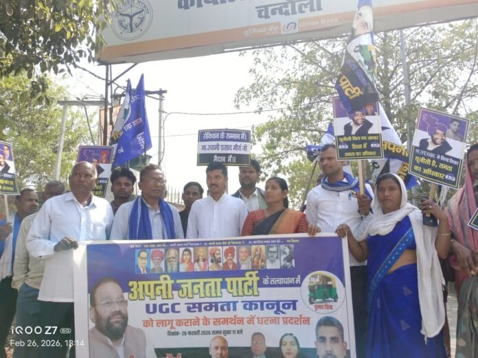 चंदौली। राष्ट्रीय अध्यक्ष स्वामी प्रसाद मौर्य के आवाहन पर बृहस्पतिवार को अपनी जनता पार्टी के जिलाध्यक्ष सुजीत कुमार मौर्य के नेतृत्व में कार्यकर्ताओं ने कलेक्ट्रेट पहुंचकर जिलाधिकारी के माध्यम से महामहिम राष्ट्रपति के नाम संबोधित ज्ञापन सौंपा। ज्ञापन में यूजीसी एक्ट 2026 को शीघ्र लागू करने की मांग की गई।