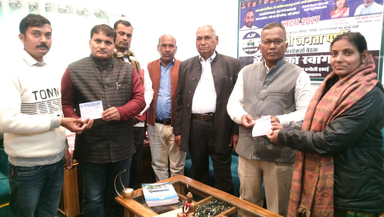 चंदौली। अपनी जनता पार्टी की एक महत्वपूर्ण बैठक कैंप कार्यालय पर आयोजित की गई। जिसमें पार्टी के नए पदाधिकारियों की नियुक्ति की गई। इस दौरान अर्जुन आर्य प्रसाद को प्रदेश सचिव नियुक्त किया गया। वही कमलेश सिंह मौर्य को मंडल महासचिव बनाया गया। बैठक में पार्टी के अन्य वरिष्ठ नेताओं और कार्यकर्ताओं ने भी भाग लिया।