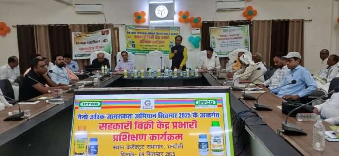 चंदौली मुख्यालय स्थित कलेक्ट्रेट सभागार में मंगलवार को नैनो उर्वरक जागरूकता अभियान के अंतर्गत जिलास्तरीय सहकारी कार्यकर्ता प्रशिक्षण कार्यक्रम का आयोजन किया गया। जिसमें कार्यक्रम के मुख्य अतिथि सहकारी आवास एवं विकास के अध्यक्ष आरपी कुशवाहा ने किसानों को नैनो यूरिया व जिंक के बारे में विस्तार से जानकारी दी।