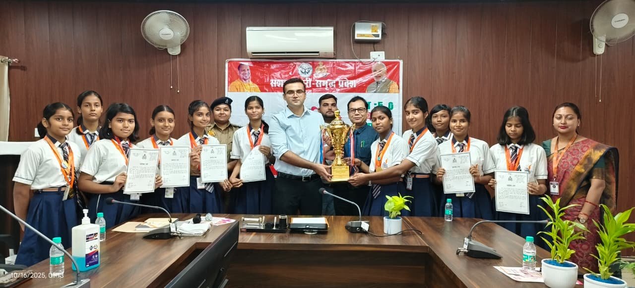 चंदौली। मिशन शक्ति अभियान फेज 5.0 के तहत गुरुवार को शिविर पुलिस लाइन चन्दौली के नवीन सभागार में पुलिस अधीक्षक चन्दौली आदित्य लांग्हे द्वारा अपर पुलिस अधीक्षक ऑपरेशन दिगम्बर कुशवाहा व क्षेत्राधिकारी सकलडीहा स्नेहा तिवारी की उपस्थिति में जयपुरिया स्कूल की छात्राओं को सम्मानित व जागरूक करने हेतु कार्यक्रम का आयोजन किया गया। कार्यक्रम के दौरान स्कूल की 11 छात्राओं (जो सीबीएससी नेशनल कबड्डी चैम्पियनशिप में ब्रोंज मेडल हासिल करने वाली) को प्रशस्ति पत्र देकर सम्मानित किया।