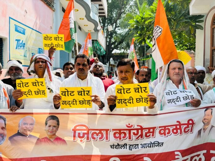 चंदौली। कांग्रेस ज़िलाध्यक्ष अरुण द्विवेदी के नेतृत्व में सोमवार को कार्यकर्ताओं ने ब्लॉक मुख्यालय पर वोट चोरी के विरुद्ध वोट चोर गद्दी छोड़ नारे के साथ पैदल मार्च निकाला। वही रैली धनापु शहीद स्मारक पहुचकर सभा में परिवर्तित हो गया। जहा कांग्रेस नेताओं ने कार्यकर्ताओं को संबोधित किया।