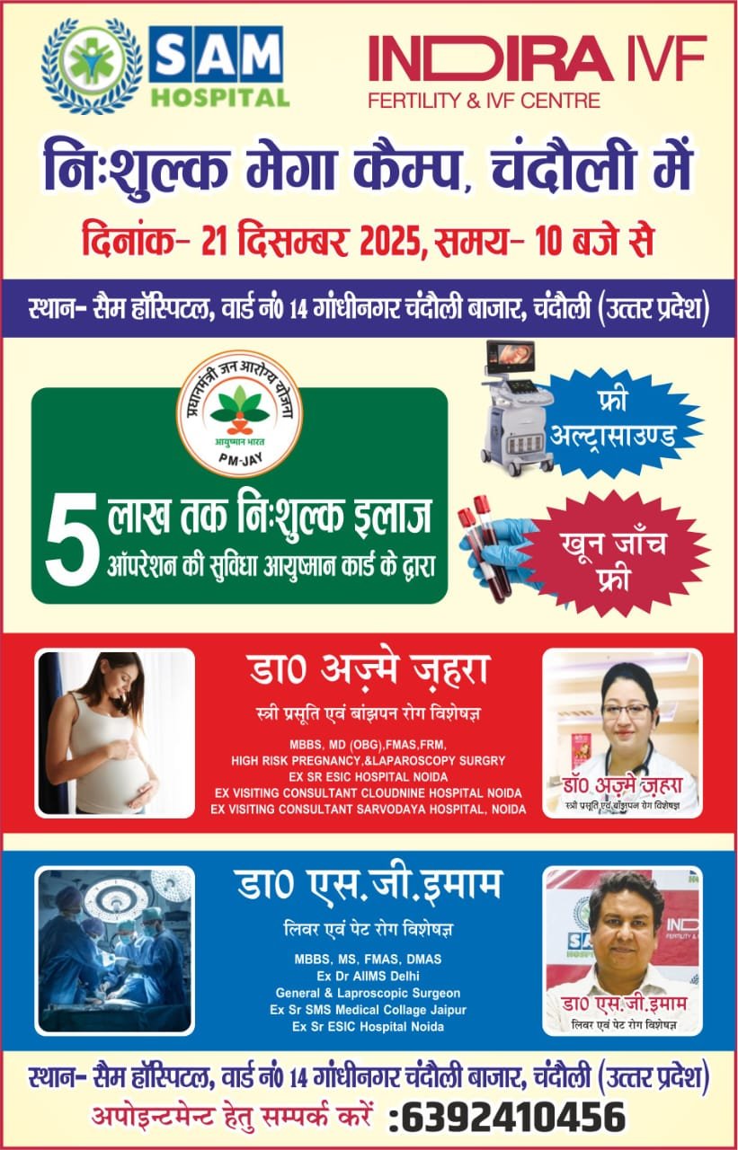 चंदौली। सैम हॉस्पिटल की ओर से दिनांक 21 दिसंबर को एक निशुल्क मेगा आयुष्मान स्वास्थ्य शिविर का आयोजन किया जा रहा है। इस शिविर का उद्देश्य आम नागरिकों को बेहतर स्वास्थ्य सुविधाएं उपलब्ध कराना तथा केंद्र सरकार की आयुष्मान भारत योजना के प्रति लोगों को जागरूक करना है।