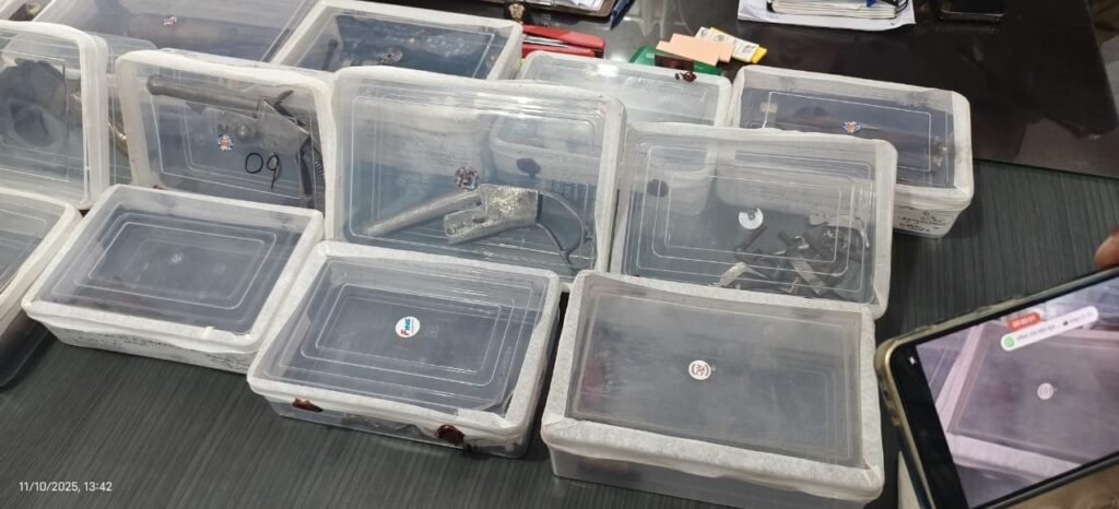 इस दौरान उन्होंने बताया कि बलुआ पुलिस को मुखबिर से सूचना मिली कि नदेसर गांव में एक घर के अंदर अवैध शस्त्रों का फैक्ट्री हैं। जिसमें असलहों का निर्माण होता हैं। और उसको खरीद फरोख्त किया जाता हैं। मुखबिर की इस सूचना पर पुलिस ने तत्काल फैक्ट्री के आस पास घेरे बंदी कर असलहा बना रहे एक सरगना को धर दबोचा। जिसकी पहचान नदेसर मारुफपुर गांव निवासी संजय शर्मा उर्फ संजू के रूप में हुई हैं। वही पुलिस ने फैक्ट्री से असलहा बनाने का बट एवं लोहे की बाडी रिपीट लगी हुई नाल व नाल घिसकर बनायी गयी नाल लोहे का ट्रिगर लोहे का इजेक्टर लकड़ी का गुटखा छोटी बड़ी स्प्रिंग लोहे की बाडी बनाने वाला पतरा हैमर तमंचे में लगाने वाली लोहे की पट्टी तमंचे की नाल में लगने वाली लोहे की पट्टी तमंचे में लगाने लगाने की रिपिट छोटी बड़ी लोहे की बोल्ट स्क्रू तमंचे की बाडी बनाने वाला प्लेट लोहा काटने की आरी छोटी आरीमय ब्लेड आरी ब्लेड नाल बनाने वाला लोहे की सुम्मी बिट लगा हुआ