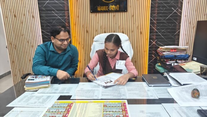 चन्दौली। उत्तर प्रदेश सरकार के मिशन शक्ति अभियान 5.0 को बढावा देने व छात्राओं को प्रोत्साहित करने के उद्देश्य से कस्तूरबा गांधी आवासीय बालिका विद्यालय सदर में कक्षा 8 की छात्रा कुमारी आकांक्षा मौर्य को एक दिन के लिए जिला बेसिक शिक्षा अधिकारी बनाया गया।बीएसए बनी छात्रा ने कार्यालय का निरीक्षण कर किया। साथ समीक्षा बैठक कर निर्देश दिया कि जिले के विद्यालयों में सप्ताह में एक दिन खेलकूद का समय निर्धारित किया जाएगा। खेल और शिक्षा को लेकर छात्रा द्वारा दिए गए सुझाव की बात को खुद बीएसए ने अमल करने की बात कही है। वही बेसिक शिक्षा अधिकारी सचिन कुमार ने मिशन शक्ति के बारे में जानकारी दी। उन्होंने बताया कि यह कार्यक्रम महिला सशक्तिकरण की दिशा में एक महत्वपूर्ण कदम है। इस मिशन का उद्देश्य महिलाओं को सुरक्षा, संरक्षण और आत्म निर्भरता प्रदान करना है।
