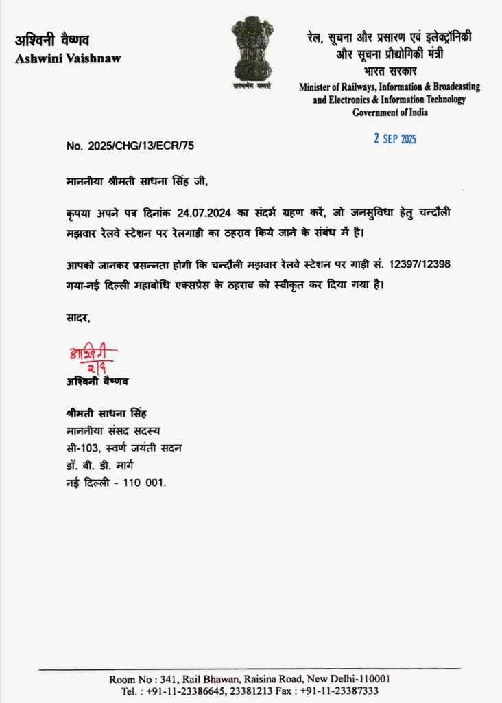 दरसअल राज्यसभा सांसद ने चंदौली वासियों को ट्रेन से आवागमन में हो रही परेशानियों को देखते हुए रेल मंत्री अश्विनी वैष्णव को पत्रक के माध्यम से नई दिल्ली महाबोधि एक्सप्रेस ट्रेन को चंदौली-मझवार स्टेशन पर ठहराव के लिए आग्रह किया था। जहा जनपदवासियों के परेशानी को गंभीरता से लेते हुए रेल मंत्री अश्विनी वैष्णव ने नई दिल्ली महाबोधि एक्सप्रेस के ठहराव को स्वीकृत कर दिया गया है। अब जल्द ही चंदौली मझवार पर नई दिल्ली महाबोधि एक्सप्रेस के ठहराव होने वाला हैं। जिससे चंदौली वासियो में हर्ष व्याप हैं।