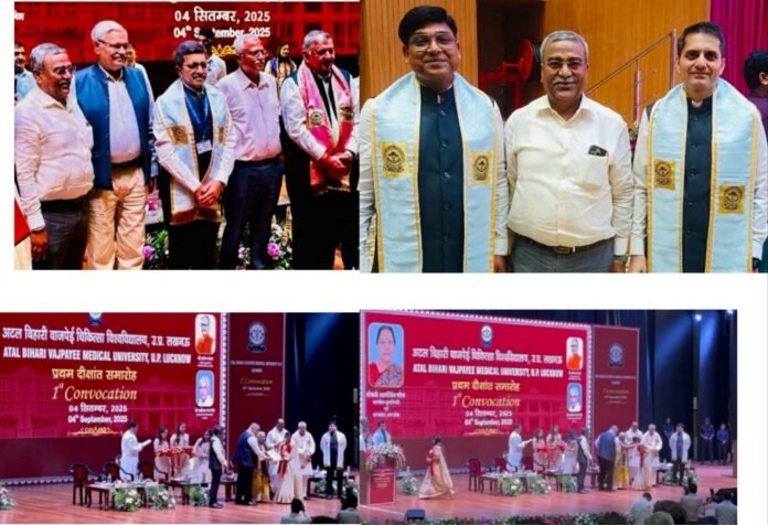चंदौली। राज्यपाल आनंदीबेन पटेल की अध्यक्षता में अटल बिहारी वाजपेयी चिकित्सा विश्वविद्यालय लखनऊ का प्रथम दीक्षांत समारोह सम्पन्न हुआ। इस मौके पर मुख्य अतिथि उपमुख्यमंत्री ब्रजेश पाठक विशिष्ट अतिथि मयंकेश्वर शरण सिंह अटल बिहारी वाजपेयी चिकित्सा विश्वविद्यालय के कुलपति डॉ संजीव मिश्रा मौजूद रहे।