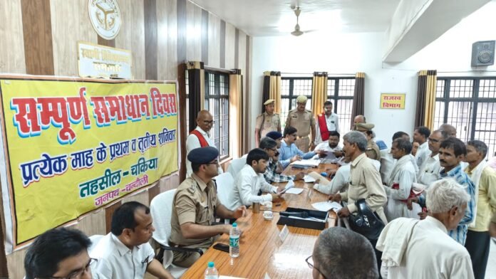 चंदौली। जिलाधिकारी चन्द्र मोहन गर्ग व पुलिस अधीक्षक आदित्य लांग्हे की अध्यक्षता में शनिवार को चकिया तहसील में जिलास्तरीय सम्पूर्ण समाधान दिवस का आयोजन किया गया। इस दौरान उनके समक्ष कुल 73 प्रार्थना पत्र पड़े जिनसे से तीन का मौक़े से निस्तारण कर दिया। साथ ही एक दर्जन से अधिक शिकायतों में टीम भेजकर निस्तारण के साथ रिपोर्ट प्रस्तुत करने के कड़े निर्देश दिए गए। वही बिना सूचित किए सम्पूर्ण समाधान दिवस में अनुपस्थित रहने पर आधा दर्जन से अधिक अधिकारियों को कारण बताओं नोटिस जारी करने के लिए उप जिलाधिकारी को निर्देश दिए।